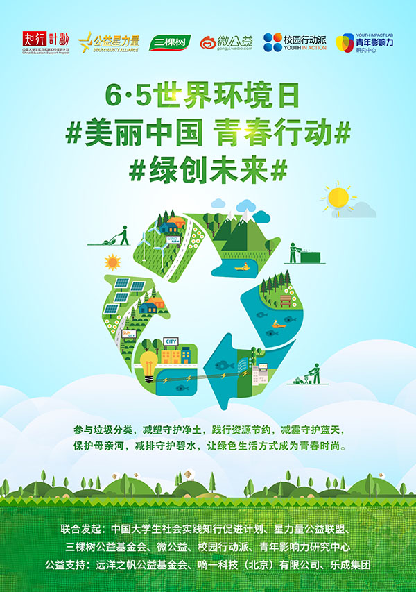 为响应团中央“美丽中国·青春行动”号召,知行计划联合星力量公益联盟、三棵树公益基金会等多方公益伙伴,将在6月5日“世界环境日”,邀请100+青年艺人、大学生志愿者,开展#美丽中国 青春行动# #绿创未来#微博话题传播活动,通过 #美丽中国 青春行动#绿色生活随手拍活动,影响更多人关注、记录并分享身边的绿色生活,助力绿色生活方式成为青春时尚。