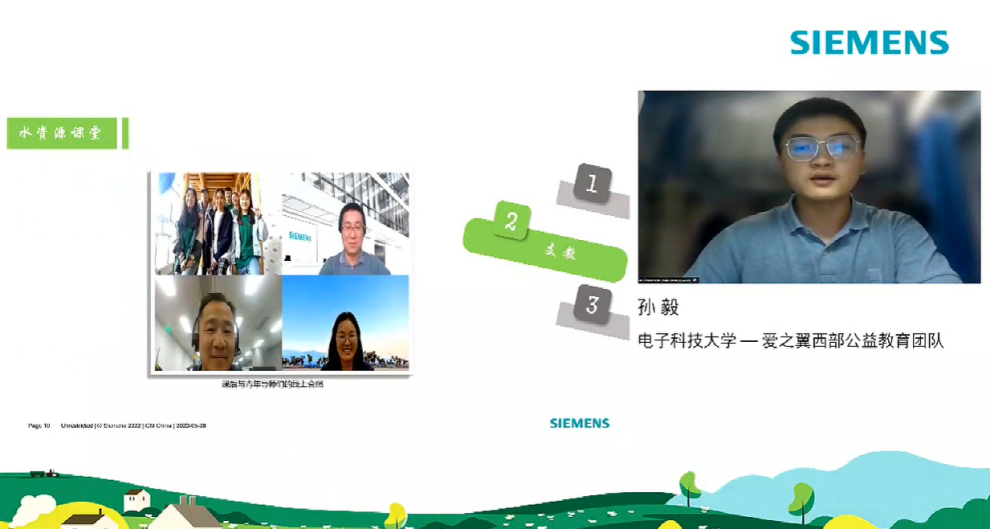 孙毅同学分享中的青年导师,是“爱绿”计划的重要一环,四年来,共有123位西门子青年导师赋能同学们的支教实践。